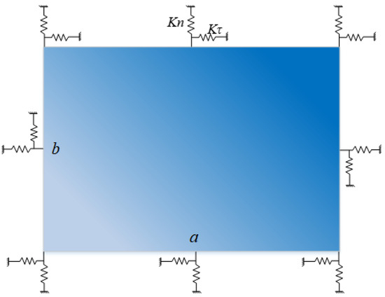 Considering the structural model of a rectangular plate composed of a metal–ceramic in-plane functionally graded material (FGM), as depicted in Figure 1, the dimensions of this FGM plate are defined by its length a, width b, and thickness h. The four boundaries of this plate are specified (). The springs are evenly distributed in both the normal and tangential directions, with their respective normal and tangential stiffnesses denoted as and .