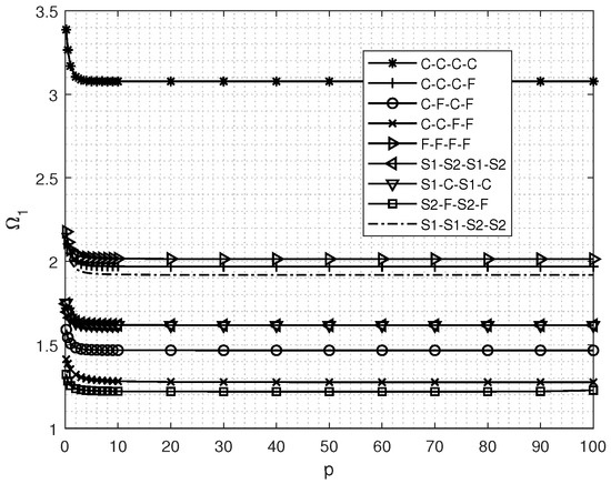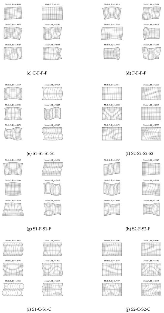 The specific corresponding results are as follows: for , for , for , and for . Especially when and take some special values, they can degenerate into several common boundary conditions; the boundary can be taken as an example, with , and for four boundary conditions being as follows: fixed edge(C), free edge(F), special boundary 1(S1), special boundary 2(S2).