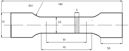 Nanoindentation tests were conducted using a Nano Indenter G200 system (Keysight Technologies, Santa Rosa, CA, USA) with a Berkovich tip. The tests employed a depth-controlled method with continuous stiffness measurement (CSM) [22], setting the maximum indentation depth to 200 nm. The strain rate was 0.05 s−1, harmonic displacement 2 nm, frequency 45 Hz, and loading rate 10 nm/s. The sampling of tensile specimens was as follows: starting from the stainless steel side, a 6 mm thick specimen was taken with stainless steel and weathering steel, each accounting for 3 mm, and then processed into tensile test specimens (according to GB/T 228.1-2021 [23]) as shown in Figure 2, the loading speed was set to 2 mm/min, and two parallel specimens were tested under each condition.