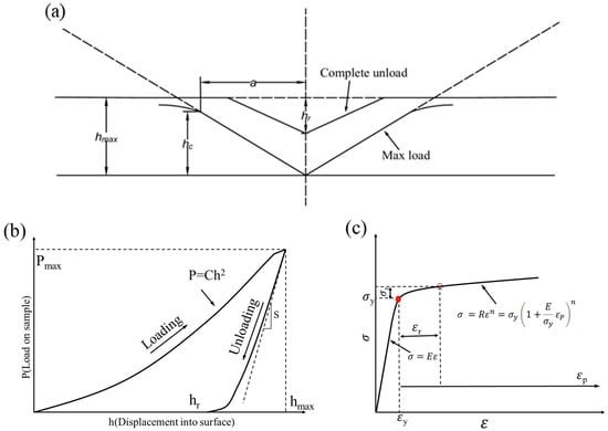 In the formula, for the elastic deformation under the Berkovich indenter at initial unloading, c* = 1.167, the elastic modulus E and the discount modulus Er of the specimen microregion can be obtained by coupling Equations (4) and (5), and then the microregion stress–strain relationship can be further obtained, and a series of quantitative analysis methods proposed by Dao [15] et al. can be used to obtain the complete microregion stress–strain relationship (Figure 3c shows the schematic diagram of the power law elasto-plastic stress–strain behavior):