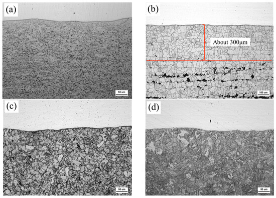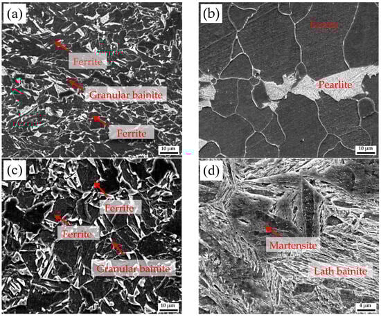Figure 5 shows the microstructure in the weathering steel matrix (away from the interface) of R, FC, AC, and WC samples. In the R sample, a ~20 μm ferrite layer is observed near the interface (Figure 3a), while the matrix consists of granular bainite and ferrite. In the FC sample, the interface-adjacent region contains a ~300 μm thick ferrite layer (Figure 3b), and the matrix comprises ferrite and pearlite. In the AC sample, the structure is ferrite plus granular bainite. In the WC sample, a mixture of martensite and lath bainite is observed.