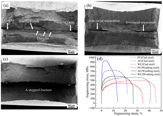 Figure 6. SEM images of tensile fracture: (a) FC, (b) AC, and (c) WC samples; (d) the stress–strain curves of clad steel and weathering steel.