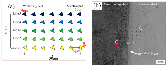 As shown in Figure 7a, nanoindentation was performed from weathering steel to stainless steel near the interface of the R sample using a 5 × 7 grid, covering an area of 20 μm × 30 μm. Figure 7b displays the actual indentation array, starting from point “1” at the lower left and ending at point “35”, with a total of 35 indents. For the FC, AC, and WC samples, nanoindentation was conducted along Line 1, Line 2, Line 3, and Line 4 only.
