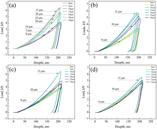 Figure 8. Load–depth curves of the localized interfacial region: (a) R, (b) FC, (c) AC, and (d) WC samples.