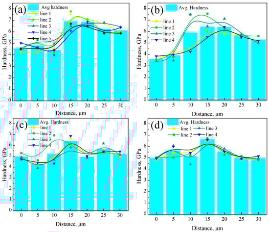 Figure 9. Hardness distribution of the localized interfacial region for different samples: (a) R, (b) FC, (c) AC, and (d) WC samples.