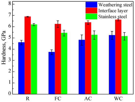 As shown in Figure 10, the average hardness values across different regions of the R, FC, AC, and WC samples are presented. The average hardness values on the weathering steel side were 4.59, 3.73, 4.80, and 5.23 GPa for the R, FC, AC, and WC samples, respectively. At the interface, the average hardness values were 6.88, 6.23, 6.37, and 6.61 GPa, while on the stainless steel side, they were 6.18, 5.43, 5.26, and 5.14 GPa, respectively.