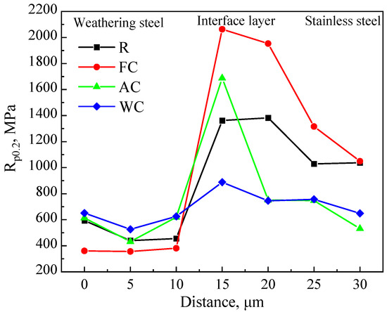 Based on the stress–strain curves, the 0.2% offset yield strength (Rp0.2) was calculated and is shown in Figure 12. The Rp0.2 values of the interfacial layers were higher than those of the adjacent metals, reaching 1361.97 MPa (R), 2062.93 MPa (FC), 1687.68 MPa (AC), and 888.45 MPa (WC), respectively. On the weathering steel side, with an increasing cooling rate (from FC to AC to WC), the microstructure transitioned from F + P and F + Gra-B to Gra-B + Lath-B, accompanied by an increase in dislocation density. Accordingly, Rp0.2 increased from 360.74 MPa (FC) to 613.80 MPa (AC) and 650.90 MPa (WC). In the R sample, although the region near the interface (about 20 μm) consisted mainly of F (Figure 3a), grain refinement and dislocation strengthening induced by two-stage rolling resulted in an Rp0.2 of 593.26 MPa. On the stainless steel side, since the austenitic structure was unaffected by cooling rate and lost rolling-induced strengthening after austenitization, the strengths of the AC and WC samples were comparable, at 747.31 MPa and 756.86 MPa, respectively. In contrast, the R sample retained the strengthening effect introduced by rolling, resulting in a higher Rp0.2 of 1037.52 MPa [27,28,29].