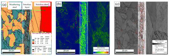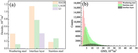 The measured dislocation and grain boundary densities are summarized in Table 3 and shown in Figure 14a,b. Quantitative analysis of the EBSD data using AZtecCrystal software revealed that, within the interfacial layer, the high-angle grain boundary (HAGB) density was 1.16 × 1012 /m2, low-angle grain boundary (LAGB) density was 0.78 × 1012 /m2, TB density was 0.42 × 1012 /m2, and the GND density reached 12.29 × 1014 /m2. All of these values were significantly higher than those in the adjacent weathering steel and stainless steel regions.
