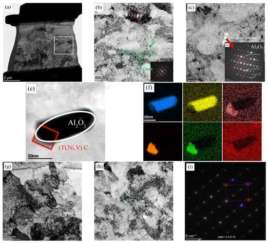 Figure 15. TEM analysis of the interface layer in R samples: (a) overall morphology; (b,c,e) inclusion distribution; (d) corresponding diffraction patterns of (c); (f) EDS elemental maps; (g) dislocations; (h) twin structures; and (i) their diffraction pattern.