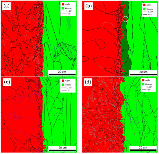 As shown in Figure 17, EBSD phase maps of the R, FC, AC, and WC samples revealed distinct interfacial features. In all four samples, numerous small protrusions of the alpha (α) phase extended into the adjacent gamma (γ) phase near the interface, often aligned along grain boundaries. These protrusions were most prominent in the FC sample (Figure 17b), with some penetrating as deep as 2.8 μm. Since the primary difference among FC, AC, and WC was the cooling rate, these α-phase intrusions into the γ-phase were inferred to form during the cooling stage. Additionally, the morphology of austenite grains near the interface differed from that in regions farther away. For example, in Figure 17b, as highlighted in dark contrast, the interfacial A grains exhibited features more closely resembling the F grains in weathering steel.