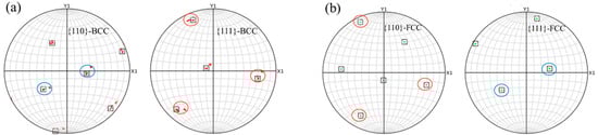 As shown in Figure 18, pole figures were generated for the alpha-phase protrusion and the adjacent gamma-phase region above it. The <110> and <111> pole figures were obtained by analyzing the EBSD data from the white-circled alpha-phase protrusion and the adjacent dark gamma-phase in Figure 18b using AZtecCrystal software. The analysis revealed a Kurdjumov–Sachs (K–S) orientation relationship between the two grains, specifically {111}γ ∥ {110}α [36,37]. This indicates that the dark gamma-phase grain in Figure 18b shares not only a similar morphology with the adjacent gamma grain on the left but also exhibits parallel crystallographic planes.
