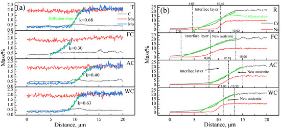 As shown in Figure 19, elements such as C, Mn, Mo, Ni, and Cr exhibited varying degrees of diffusion across the interface in the R, FC, AC, and WC samples. The extent of elemental enrichment near the phase boundary differed under different cooling conditions. For a given concentration gradient, each element showed a distinct diffusion length near the interface. For Cr, within the 5–20% concentration range, the diffusion length in the R sample was 6.9 μm, while for FC, AC, and WC samples, it increased to 11.5, 7.0, and 7.3 μm, respectively. For Mo (0.3–2.0%), the diffusion lengths were 2.9 μm for R, and 4.5, 4.6, and 2.6 μm for FC, AC, and WC, respectively. For Ni (0.3–10.0%), the diffusion lengths were 1.4 μm for R, and 5.3, 4.6, and 3.2 μm for FC, AC, and WC, respectively. To quantify this behavior, linear fitting was applied to the element concentration profiles using Origin software within the specified gradient range. The slope (k) of the fitted line was used to characterize interfacial diffusion, where a smaller k value indicates a greater degree of diffusion.