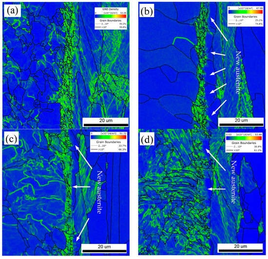 Figure 20. GND and new austenite of the localized interfacial region: (a) R, (b) FC, (c) AC, and (d) WC samples.