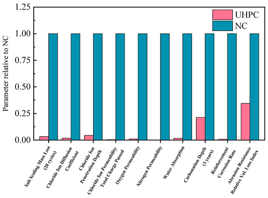 UHPC exhibits excellent properties, such as ultra-high strength, high toughness, high durability, and strong self-healing ability for microcracks, which can effectively improve its service life and reduce maintenance. The compressive strength of UHPC generally exceeds 150 MPa, which is about 3 to 16 times that of NC. By incorporating steel fibers, the ductility and energy absorption capacity of UHPC usually exceed those of High-Performance Concrete (HPC) by more than 300 times, which can effectively improve the seismic performance of members [18]. The high durability of UHPC is reflected in its ability to resist environmental erosion, such as freeze–thaw resistance, salt erosion resistance, and carbonization resistance. Compared with NC, all durability indicators of UHPC are better, and the durability comparison results between NC and UHPC are listed in Figure 1 [19,20]. This benefits from UHPC’s own dense and uniform structure, extremely few pores, and very small water-binder ratio. There is almost no excess moisture inside, which helps it better resist the penetration of potentially harmful and corrosive media, such as chloride, sulfate, water, carbon dioxide, and oxygen, thus exhibiting excellent carbonization resistance, impermeability, freeze–thaw resistance, and wear resistance [21,22]. Moreover, studies have shown that the freeze–thaw scaling of UHPC is 1/140 of that of NC, indicating that UHPC has excellent freeze–thaw resistance [23] and can be used in areas with large diurnal temperature differences. Liu et al. [24] found that after 600 freeze–thaw cycles, the durability coefficient of UHPC is greater than or equal to 100, and the mass loss is almost zero. Lee et al. [25,26] confirmed the low permeability and freeze–thaw resistance of UHPC, indicating its excellent durability in different applications. Despite its many advantages, UHPC also has relatively prominent disadvantages. The cement content of UHPC is as high as 800–1000 kg/m3, and it has a large hydration heat and a more complex production process, is prone to shrinkage cracks, and has a high cost [27].