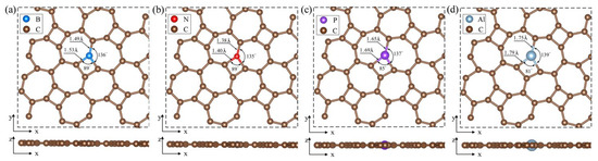 To explore the effect of the impurity atom substitutional doping in thgraphene on its material properties, we selected elements located around carbon in the periodic table, such as B, N, P, and Al. These elements are abundant and readily obtainable in nature. Furthermore, the radii of their corresponding atoms do not differ significantly from that of the C atom, ensuring structural compatibility and facilitating the reduction in doping-induced lattice distortions. Additionally, the valence electron orbital energy levels of these neighboring elements are similar. This gradual adjustment of the electronic structure is more conducive to the synergistic optimization of the carrier concentration and mobility.