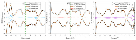 The density of states of the doped and pristine thgraphene. (a–c) correspond to the density of states for BC1-thgraphene, NC1-thgraphene, and PC1-thgraphene, respectively.