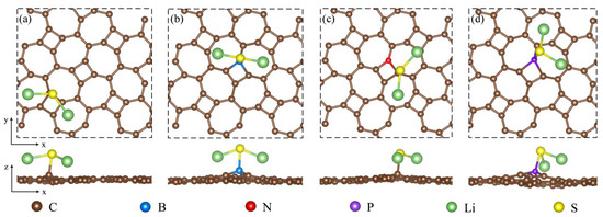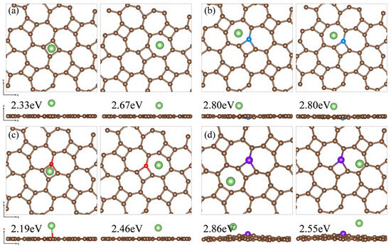 Based on the adsorption configuration of Li2S, we initially placed the Li atom at two relatively stable adsorption sites: the center of the four-membered carbon ring and the center of the seven-membered carbon ring on the substrate surface. DFT optimization results and adsorption energy calculations indicate that Li atoms tend to be adsorbed at the center of the seven-membered carbon ring. In Figure 11a, the adsorption energy of the thgraphene storing one Li atom is 2.67 eV, which is higher than that of BSi4 (1.50 eV) [64] and Cu2Si (2.40 eV) [65], demonstrating that thgraphene possesses a superior adsorption strength for Li. In Figure 11b,d, the local positive charge centers introduced by B and P atoms exert a noticeable repulsive effect on Li, causing the Li atom to preferentially adsorb at stable sites distant from B and P. The adsorption energies of the Li atom on B and C are as high as 2.80 eV and 2.86 eV, respectively, indicating that doping with B and P atoms enhance the lithium storage capacity of the substrate. In Figure 11c, the adsorption energy of Li on the N surface is 2.46 eV, which is slightly lower than that of the pristine thgraphene.