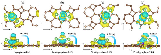 As shown in Figure 5c,d, more charge transfer occurs in both NC1-thgraphene/Li2S and PC1-thgraphene/Li2S systems. The amounts of charge transferred from the Li2S cluster to substrates are 0.211|e| and 0.247|e|, respectively. In the case of NC1-thgraphene, an electron-rich region is formed that tends to donate electrons to the S atom [55]. This leads to repulsion with the inherently electron-rich nature of the S atom itself. Despite the charge transfer, its direction contradicts the electrostatic complementary expected for strong adsorption, thereby weakening the N-S interaction. As seen in Figure 5d, the larger atomic radius of P increases the bond lengths between P and its neighboring C atoms, resulting in a more dispersed electron cloud. This facilitates the formation of stable bonds with the lone-pair electrons of S through lone pair–lone pair interactions [47]. Furthermore, the calculated differential charge density reveals that P-doped thgraphene generates a charge-depletion region, promoting the formation of a robust adsorption system for Li2S. Consequently, PC1-thgraphene demonstrates an adsorption energy of up to 4.48 eV, surpassing the values observed for the other three substrates.