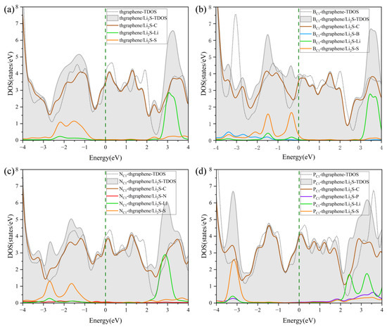 The DOS of Li2S adsorbed on (a) pristine thgraphene, (b) BC1-thgraphene, (c) NC1-thgraphene, and (d) PC1-thgraphene; the Fermi level is marked by the dark green dashed line.
