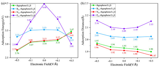 When the LiSBs are operating under normal conditions, an electric field is generated in the direction perpendicular to the anchoring material, and this field varies with the battery reaction [56]. It is therefore imperative to examine the anchoring capability and structural stability of the Li2S adsorption system under the external electric field. Based on previously reported studies involving applied electric fields [57], this work sets the electric field strength to , , , and , with the direction being perpendicular to the surface of the 2D material. The vector pointing from −z to +z is defined as the positive direction of the electric field. Figure 8 illustrates the adsorption energies and adsorption distances of Li2S on pristine thgraphene, BC1-thgraphene, NC1-thgraphene, and PC1-thgraphene substrates under the electric field. The corresponding differential charge density under the electric field is shown in Figure S8, Figure S9, Figure S10, and Figure S11, respectively.