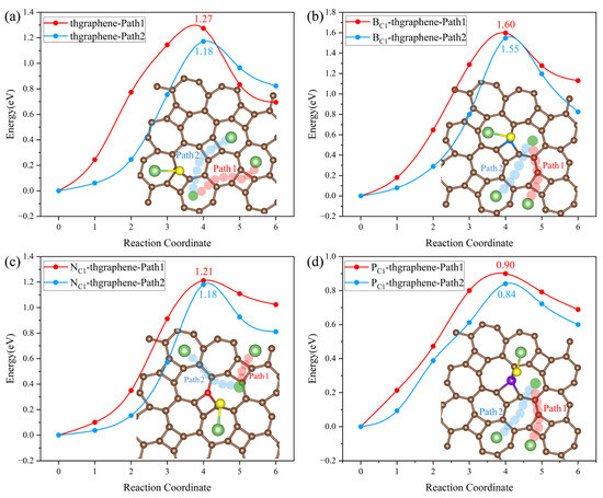 The diffusion energy barrier of Li ions on the substrate determines their migration rate and influences the capacity retention at a high current density. Meanwhile, the rapid diffusion of Li can enhance the conversion reaction kinetics of LiPSs, suppress their dissolution and shuttling, and thereby improve the sulfur utilization and electrochemical stability upon repeated cycling [59]. In this work, the diffusion energy barrier was calculated using the CI-NEB method. The calculations are based on the diffusion of a Li ion from a stable adsorption site to another near equivalent site. Considering the structural characteristics of the thgraphene and the influence of doping, the diffusion paths for the four types of substrates are set as shown in Figure 9a and Figure 9d, respectively. In Figure 9a,d, the diffusion paths depicted by the four different-colored small spheres represent the optimal diffusion paths obtained through calculations. Figure 9a illustrates the actual diffusion paths (Path1 and Path2) corresponding to the pristine substrate, as well as the B- and N-doped substrates. In contrast, Figure 9d shows the actual diffusion paths (Path3 and Path4) corresponding to the P-doped substrate.