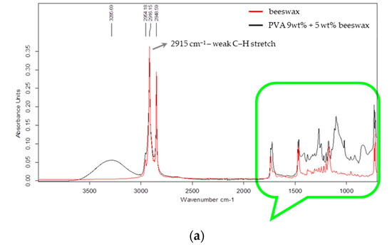 The main spectral differences between beeswax and the mixed PVA/BW composition are observed in the region 1800–700 cm