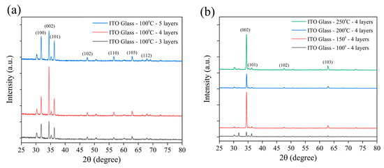 XRD analysis patterns of ZnO NRs on ITO–glass substrates: (a) the effect of different numbers of seed layers (3–5 layers) on the crystal structure of ZnO NRs at a fixed annealing temperature of 100 °C; (b) the effect of different annealing temperatures (100–250 °C) on the crystal structure of ZnO NRs under a fixed condition of 4 seed layers.