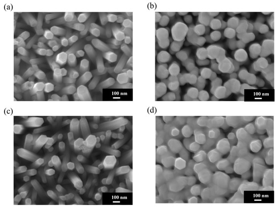 Figure 1 shows the SEM surface morphologies of ZnO NRs grown on ITO–glass substrates using four seed layers and annealed at various temperatures (100 °C, 150 °C, 200 °C, and 250 °C). These SEM images clearly illustrate the significant impact of annealing temperature on the morphology, density, size, and alignment of the ZnO NRs. Samples grown at an annealing temperature of 100 °C (Figure 1a) exhibited relatively larger but lower-density hexagonal columnar structures. The NRs had diameters of approximately 200–300 nm, varying heights, and a somewhat scattered arrangement. However, their growth orientation was rather random, with many NRs appearing tilted or lying flat. This suggests that at lower annealing temperatures, the crystallinity and uniformity of the seed layer were insufficient, leading to inconsistent growth directions of the ZnO NRs [52,53]. As the annealing temperature increased to 150 °C (Figure 1b), the density of the ZnO NRs significantly increased, their diameters decreased to approximately 100–150 nm, and they showed a more uniform distribution and improved vertical alignment. Further increasing the annealing temperature to 200 °C (Figure 1c) led to continued improvement in the density and vertical alignment of the ZnO NRs. The nanorod diameters ranged from approximately 80 to 120 nm, and they were more densely packed and vertically oriented. When the annealing temperature reached 250 °C (Figure 1d), the ZnO NRs exhibited optimal morphological characteristics: uniform diameters (approximately 80–100 nm), consistent heights, the highest density, and nearly perfect vertical alignment for most NRs. The hexagonal structures at the tops of these NRs were more distinct, and their sidewalls were smooth, indicating significantly improved crystallinity. Furthermore, the inter-nanorod spacing was appropriate, approximately 30–50 nm, a structure beneficial for the uniform deposition of subsequent metal nanoparticles and providing sufficient space for analyte molecule adsorption. The influence of annealing temperature on the morphology of ZnO NRs can be attributed to several factors. Firstly, higher annealing temperatures promote the maturation and recrystallization of ZnO nanocrystals within the seed layer, reducing defects and grain boundaries, and thereby improving the crystallinity of the seed layer. Secondly, high-temperature annealing enhances the uniformity and orientation of the seed layer, providing more and more uniformly distributed nucleation sites, which favors the vertical growth of ZnO NRs. Finally, a high-quality seed layer can reduce secondary nucleation during subsequent hydrothermal growth, leading to a nanorod array with a more uniform size and orientation.