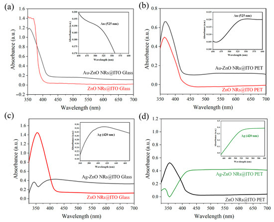 UV-Vis absorption spectra of ZnO NRs and metal–ZnO structures on different substrates. (a) ZnO NRs (red line) and Au-ZnO NCPs (black line) on ITO–glass substrate; (b) ZnO NRs (red line) and Au-ZnO NCPs (black line) on ITO-PET substrate; (c) ZnO NRs (red line) and Ag-ZnO NCPs (black line) on ITO–glass substrate; (d) ZnO NRs (black line) and Ag-ZnO NCPs (green line) on ITO-PET substrate. The insets in each figure show magnified views of the characteristic LSPR absorption peaks of the metal nanostructures.