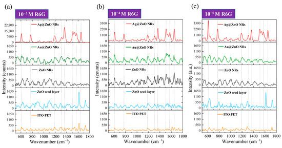 Raman spectral responses of R6G molecules on different SERS substrates on flexible ITO-PET at (a) 10−3 M R6G, (b) 10−4 M R6G, and (c) 10−5 M R6G.