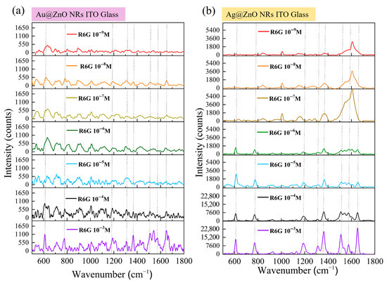To thoroughly evaluate the detection performance of the prepared SERS substrates, we systematically tested the ability of both Au-ZnO and Ag-ZnO composite structures on ITO–glass substrates to detect R6G molecules at extremely low concentrations. Figure 10 illustrates the detection performance of the two SERS substrates in the concentration range of 10−3 M to 10−9 M. Figure 10a shows the SERS response of Au-ZnO NCPs, prepared by the PLIP method with varying concentrations of R6G. As the R6G concentration decreased, the SERS signal intensity gradually diminished. At higher concentrations (10−3 M and 10−4 M, purple and black lines in Figure 10a), all characteristic peaks of R6G were clearly visible, with a high signal intensity and clear peak shapes. This aligns with the uniform distribution of Au nanoparticles observed in previous SEM analyses (Figure 4a,b). As shown in SEM, Au nanoparticles formed a uniformly distributed coating on the ZnO nanorod surfaces, with particle sizes of approximately 10–20 nm. This morphology is conducive to forming high-density “hot spot” regions, generating strong SERS signals. When the concentration dropped to 10−5 M and 10−6 M (blue and green lines), the main characteristic peaks were still discernible. However, the signal intensity was noticeably weaker, and the signal-to-noise ratio (SNR) decreased. As the concentration further decreased to 10−7 M and 10−8 M (yellow and orange lines), the main characteristic peaks of R6G were still identifiable but became more blurred, with a further reduction in the SNR. At the extremely low concentration of 10−9 M (red line), most characteristic peaks were difficult to clearly distinguish from the background noise; only the peak at 612 cm−1 was barely discernible. This indicates that the detection limit of the Au-ZnO composite structure is approximately between 10−8 M and 10−9 M, which is already quite excellent detection sensitivity.