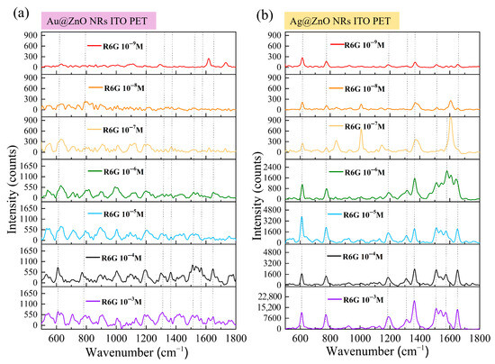 SERS performance for (a) Au-ZnO and (b) Ag-ZnO NCPs on ITO-PET substrates detecting R6G with 10−3 M to 10−9 M concentrations.