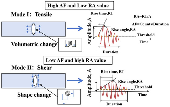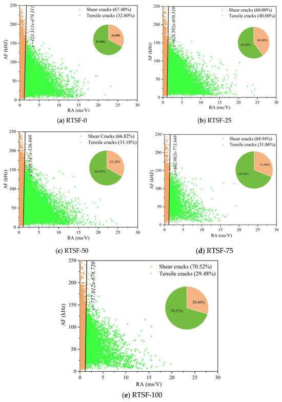 Figure 17 illustrates the RA-AF relationship of acoustic emission during the four-point bending tests of UHPSC at different replacement rates of recycled tire steel fibers.