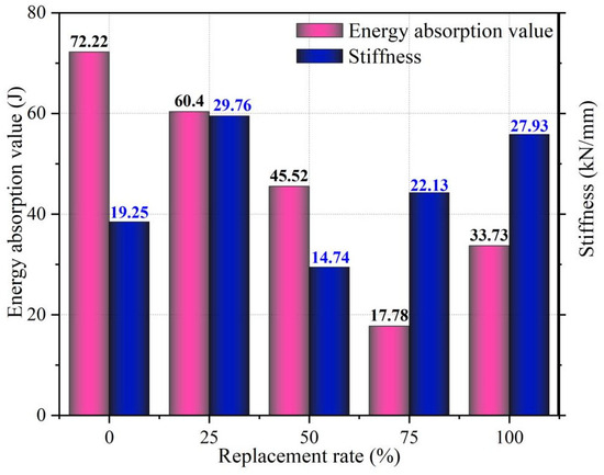 However, when the replacement ratio reached 50%, a sudden jump in the cumulative energy curve occurred toward the end of the strengthening phase, similar to the control group. This phenomenon reflects the formation of extensive internal cracking, signifying an onset of flexural capacity degradation.