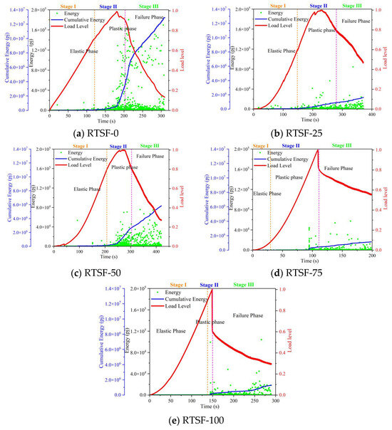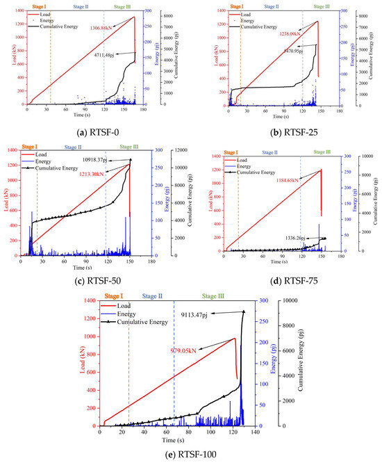 Beyond a 50% replacement ratio, the AE energy values remained consistently low, and the cumulative energy curve flattened significantly. This behavior suggests that excessive RTSF content leads to fiber clustering and uneven distribution, increasing the energy required for fiber pull-out. Furthermore, the mechanical response curve demonstrates a rapid strengthening phase followed by abrupt failure, indicating a transition toward brittle fracture behavior.