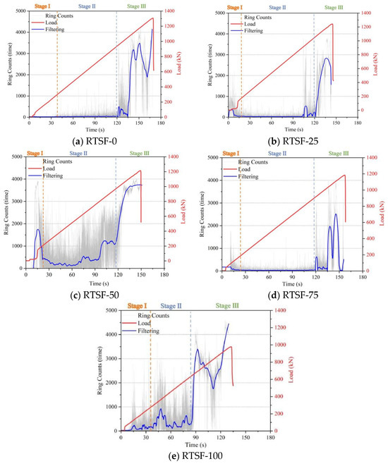At replacement ratios exceeding 50%, the AE behavior deviated significantly from previous trends. The ringing count remained nearly constant before Stage II, and no pronounced upward trend was observed even during Stage II, suggesting the absence of a plastic strengthening phase and a transition to brittle failure.