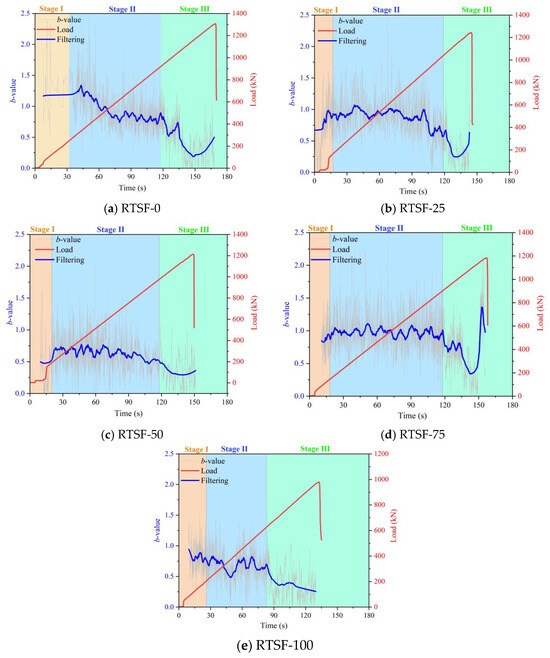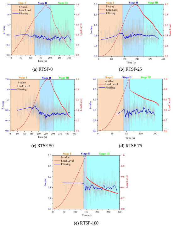 At replacement ratios exceeding 50%, the b-value profile maintains relative stability prior to Stage II, then transitions directly to the failure phase without exhibiting the characteristic strengthening stage—a clear signature of brittle fracture. This behavioral shift is attributed to interfacial deterioration between the concrete matrix and steel fibers caused by excessive fiber content, which leads to fiber clustering, stress concentration, and ultimately loss of composite integrity.