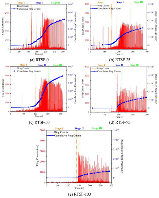 For the control group, the ringing count remained stable during Stage I, indicating a dense and homogeneous internal structure. Upon entering Stage II, the cumulative ringing count curve began to rise, reflecting the initiation and propagation of microcracks. In Stage III, the curve stabilized again, suggesting a slowdown in crack development.