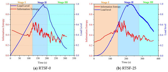 When the replacement ratio was below 50%, the entropy displayed an upward trend in Stage I, demonstrating that the incorporation of recycled tire steel fibers enhanced the complexity of the material’s microstructure. During the initial loading phase, interface friction and localized debonding between the fibers and matrix contributed to the increase in entropy.