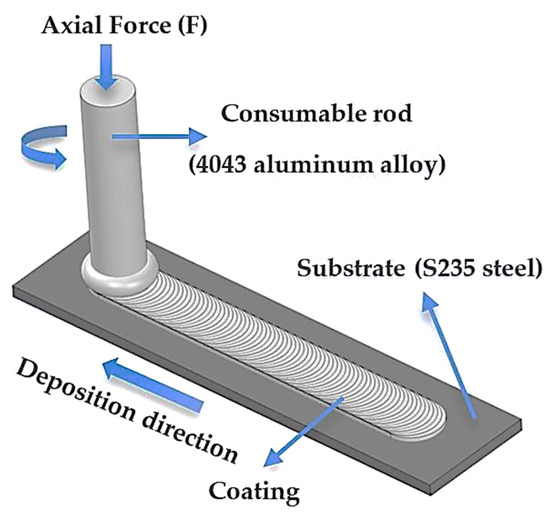 To ensure sustainable development, environmental conditions intended to boost resource usage efficiency, decrease waste output, and minimize harmful emissions have been intensely discussed. Numerous strategies have been considered in various industries to meet the specific requirements. In the transportation sector, where more than 25% of worldwide greenhouse gas emissions are released [1], significant efforts are directed towards lowering vehicle energy consumption by promoting electric vehicles, improving fuel efficiency, considering alternative fuels, or reducing CO2 emissions by adopting new design solutions [2]. Among all the factors that can influence energy consumption and gas emissions, respectively, the compactization/weight reduction of vehicles is regarded as a viable solution. Greater use of lightweight materials (aluminum, magnesium, titanium) is one of the key approaches to lower CO2 emissions, notably in the transportation industry [3]. Due to their outstanding properties, including superior corrosion resistance, increased formability, recyclability, and high strength-to-weight ratio, aluminum and its alloys have drawn a lot of attention in this specific manufacturing sector [4]. According to a published report by The Center for Automotive Research [5], lightweight vehicles are considered a top priority for the automotive industry. Mass reduction is a resourceful pathway to better recycling and improvement of vehicle performance [6]. Moreover, the possibility of joining light metals and steel facilitates the production of hybrid structures with significantly enhanced performance for the automotive industry [2]. Including light-metal components in the car body or ship hulls provides a significant weight reduction for vehicles, thus lowering emissions. In this aim, one promising and environment-friendly route is friction surfacing (FS), which is a cladding process for surface coating [7] proposed by Klopstock and Neelands in 1941 [8]. The FS process has emerged over the past few years as a method for joining both similar and dissimilar materials and for volume damage repair of expensive components [9]. FS has been continuously developed over time, with several variants, such as friction stir forming, friction stir deposition, and lateral friction surfacing [10]. This technique is considered a solid-state process, as the coatings are created at temperatures below the melting range of the involved materials [11]. FS, which is related to friction welding, employs the energy generated during the process and creates a layer of plasticized metal without using an external heat source. The possibility to produce a metallic coating without melting the material classifies this technique as distinct from other standard deposition methods [9]. The unconventional deposition route is based on the severe plastic deformation that appears on a rotating metallic rod (consumable material) pressed against the substrate material under an axial load [11]. The metallic rod used in FS is consumed during the process [7]. Since no external heat source is provided, the frictional energy generated exactly at the interface ensures the softening of the consumable material. As a consequence, a solid-state transfer occurs as a continuous shearing layer, formed during the translation at a certain speed along the substrate [12].