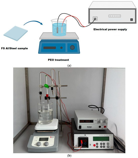 (a) Simplified schematic representation of the PEO process; (b) experimental setup.