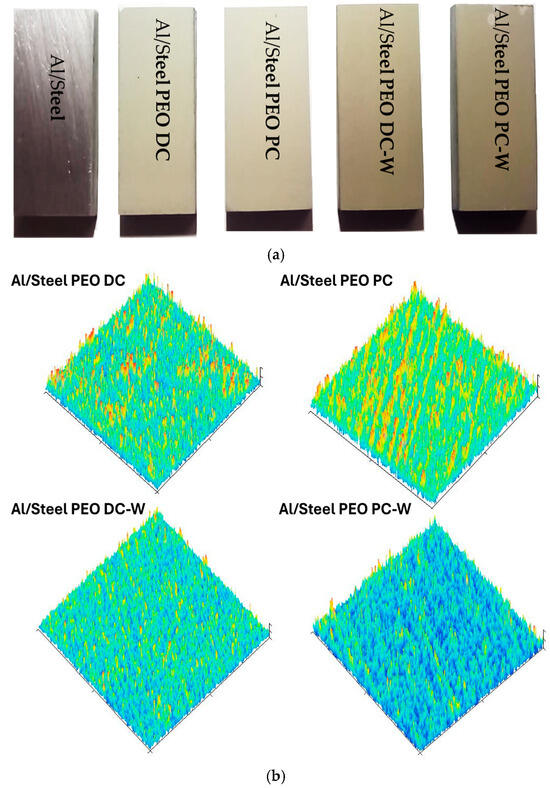 A short name was assigned for each sample, indicating the polarization mode and the type of electrolyte. The most representative samples treated using different sets of parameters are shown in the macrographic image from Figure 3a. As observed, the PEO treatment changed the bright metallic surface of the aluminum to a porous grey ceramic film, characteristic of a PEO-modified surface. The samples treated in the tungsten-containing electrolyte present a slightly darker surface, compared to the samples obtained from the silicate-based solution. To further investigate the surface morphology beyond the optical observations, 3D surface profilograms were acquired for all PEO-treated samples and are presented in Figure 3b. These profilograms provide a topographical visualization of the surface structure, highlighting differences in surface roughness and feature distribution induced by the various PEO treatment conditions. The Al/Steel PEO PC sample exhibited the highest surface roughness, with pronounced peak structures and a more heterogeneous texture compared to the DC-treated one. In contrast, the addition of tungsten in the electrolyte (Al/Steel PEO DC-W and Al/Steel PEO PC-W) led to smoother surfaces with reduced peak intensity and more uniform profiles. These observations align with the visual contrasts observed in the macrographic images (Figure 3a) and offer an insight into how the current regime and electrolyte composition affect the surface topography. All profilograms were obtained under the same scanning parameters, and the height scales were kept consistent to allow for direct comparison among the samples.