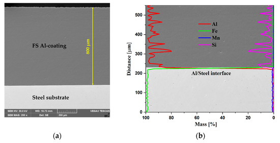 The cross-section micrograph of the FS Al/Steel sample presented in Figure 4a reveals a clean and defect-free bond along the interface. It is important to note that the samples were not etched before imaging to preserve the original interface characteristics. No gaps between the aluminum coating and the steel substrate, or any cracks and pores in the coating, can be observed. The thickness of the Al coatings is found to be between 800 and 1000 µm, measured after the surface was processed with SiC paper, to achieve a roughness of around Ra = 0.4. The EDX line scanning presented in Figure 4b was performed starting from 200 µm below the Al/Steel substrate interface to 350 µm above. The main elements from the substrate (Fe and Mn) are highlighted, while Al and Si show up only in the coating. The elemental distribution across the Al/Steel interface reveals important insights into the metallurgical bonding mechanisms during aluminum friction surfacing on S235 steel. The sharp transition between high Fe content in the steel substrate and high Al content in the deposited layer indicates a well-defined interface with minimal elemental interdiffusion. This suggests that bonding primarily occurred through a solid-state joining mechanism, facilitated by severe plastic deformation and frictional heat rather than melting, since the maximum temperatures achieved are in the range of 400–450 °C [31]. The absence of a significant diffusion zone or thick intermetallic layer implies that the process parameters were optimized to avoid excessive thermal exposure, which is critical in preventing the formation of brittle Fe-Al intermetallic compounds (Fe2Al5, FeAl3), which can compromise joint integrity. Overall, microstructural evidence supports a strong metallurgical bond dominated by mechanical interlocking and limited atomic interaction, characteristic of high-quality friction surfacing.