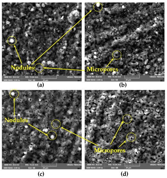Surface SEM micrograph of the (a) Al/Steel PEO DC; (b) Al/Steel PEO PC; (c) Al/Steel PEO DC-W; and (d) Al/Steel PEO PC-W.