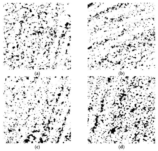 Porosity fraction of the PEO-treated samples estimated from SEM micrographs using ImageJ software: (a) Al/Steel PEO DC (10.68%); (b) Al/Steel PEO PC (9.22%); (c) Al/Steel PEO DC-W (10.49%); and (d) Al/Steel PEO PC-W (13.87%).