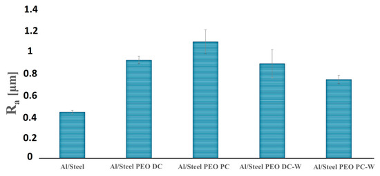 Ra surface roughness values for the Al/Steel and PEO-treated samples. The corresponding average Rz values are Al/Steel (2.25); Al/Steel PEO DC (4.66); Al/Steel PEO PC (5.57); Al/Steel PEO DC-W (4.78); and Al/Steel PEO PC-W (4.05).
