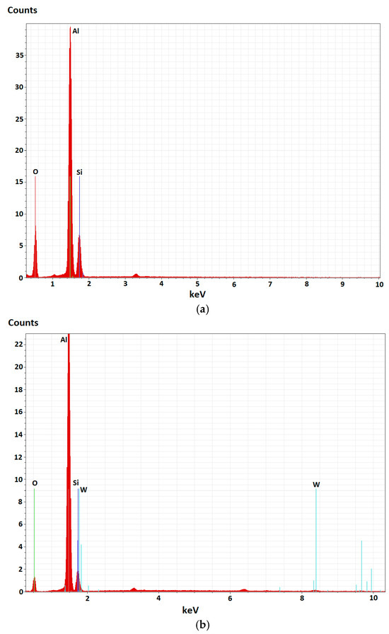 The EDX analysis depicted in Figure 10, performed on the PEO-treated surfaces, shows the elemental content of the samples. The spectra confirm the presence of Al as the main component of the coatings but also reveal additional chemical elements from the oxide layer that were incorporated from the electrolyte composition, like Si and W, demonstrating the successful integration of such constituents in the coating’s matrix through the plasma-chemical reactions that took place. During the PEO process, the electrolytes additionally provide oxygen, which reacts with the molten metal substrate, resulting in the formation of ceramic oxides, in this case, mainly Al2O3.
