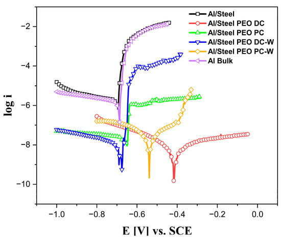 Potentiodynamic polarization curves in semi-logarithmic form measured in 3.5 wt.% NaCl solution at room temperature and 0.16 mV s−1 scan rate.
