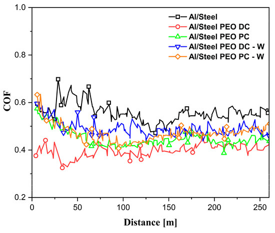 Values of the recorded COF presented in Figure 13 for the Al-based samples.