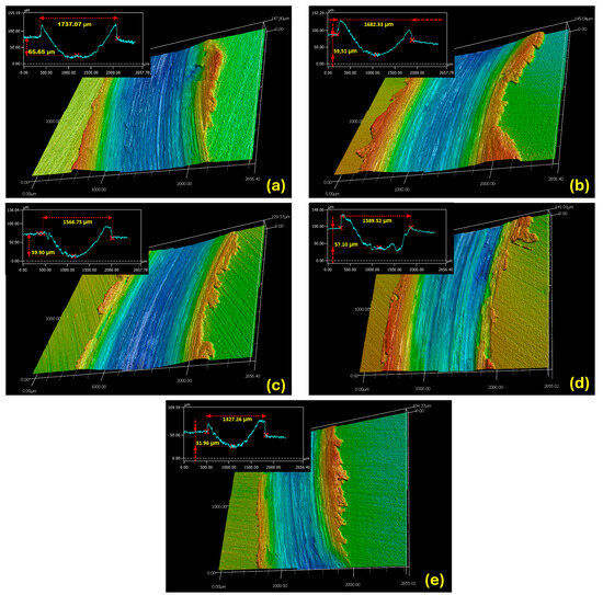 CLSM micrographs of the surface topography of the wear tracks for the Al-based samples: (a) Al/Steel; (b) Al/Steel PEO DC; (c) Al/Steel PEO PC; (d) Al/Steel PEO DC-W; and (e) Al/Steel PEO PC-W.
